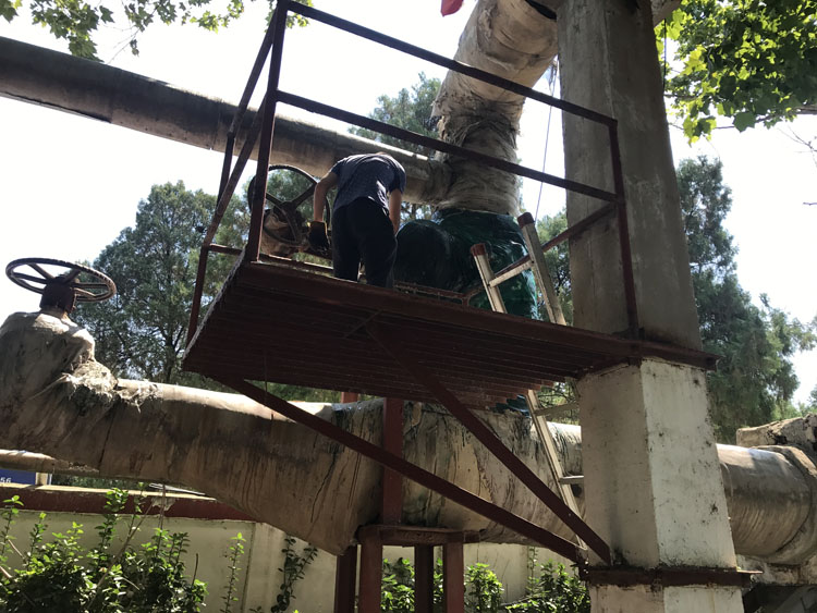 在鐵塔寺小區(qū)檢修現(xiàn)場,幾名檢修人員正頂著近36度的高溫對二次網(wǎng)管道的保溫進行修補、更換。雖然天氣悶熱,但為了保證冬季供暖效果、減少不必要的損耗、確保設備狀態(tài)良好,他們加班加點,趕著在天黑之前完成此項檢修工作。